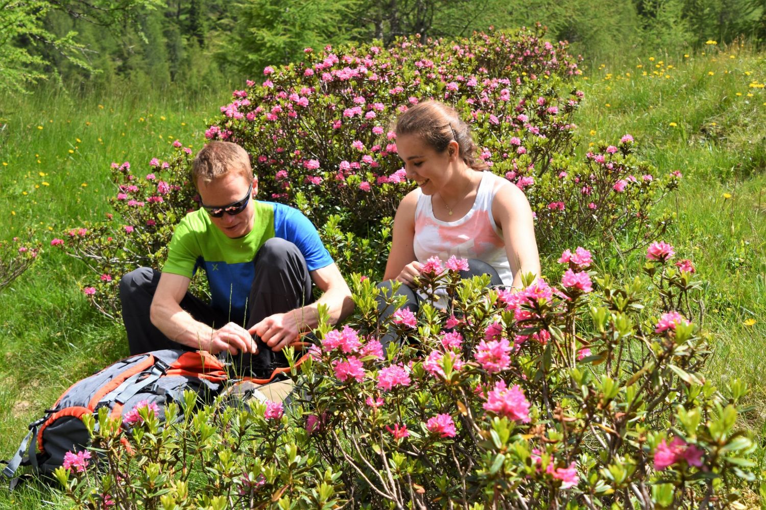 Temperature estive a fondovalle, ultimi piccoli nevai in quota e un magnifico mare di rododendri color rosa, genziane blu e molti altri fiori alpini.