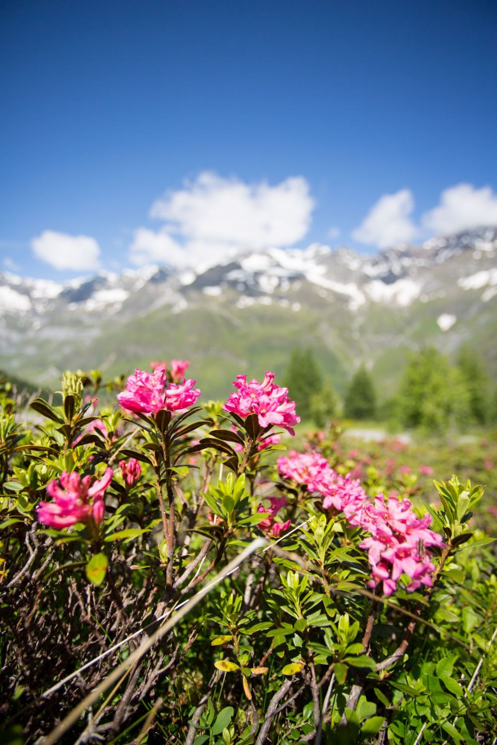 L´ultima neve è sciolta, fiore rododendri nella loro piena gloria, gioia in mezzo la natura lungo i fiori di montagna, le marmotte fischiano ...